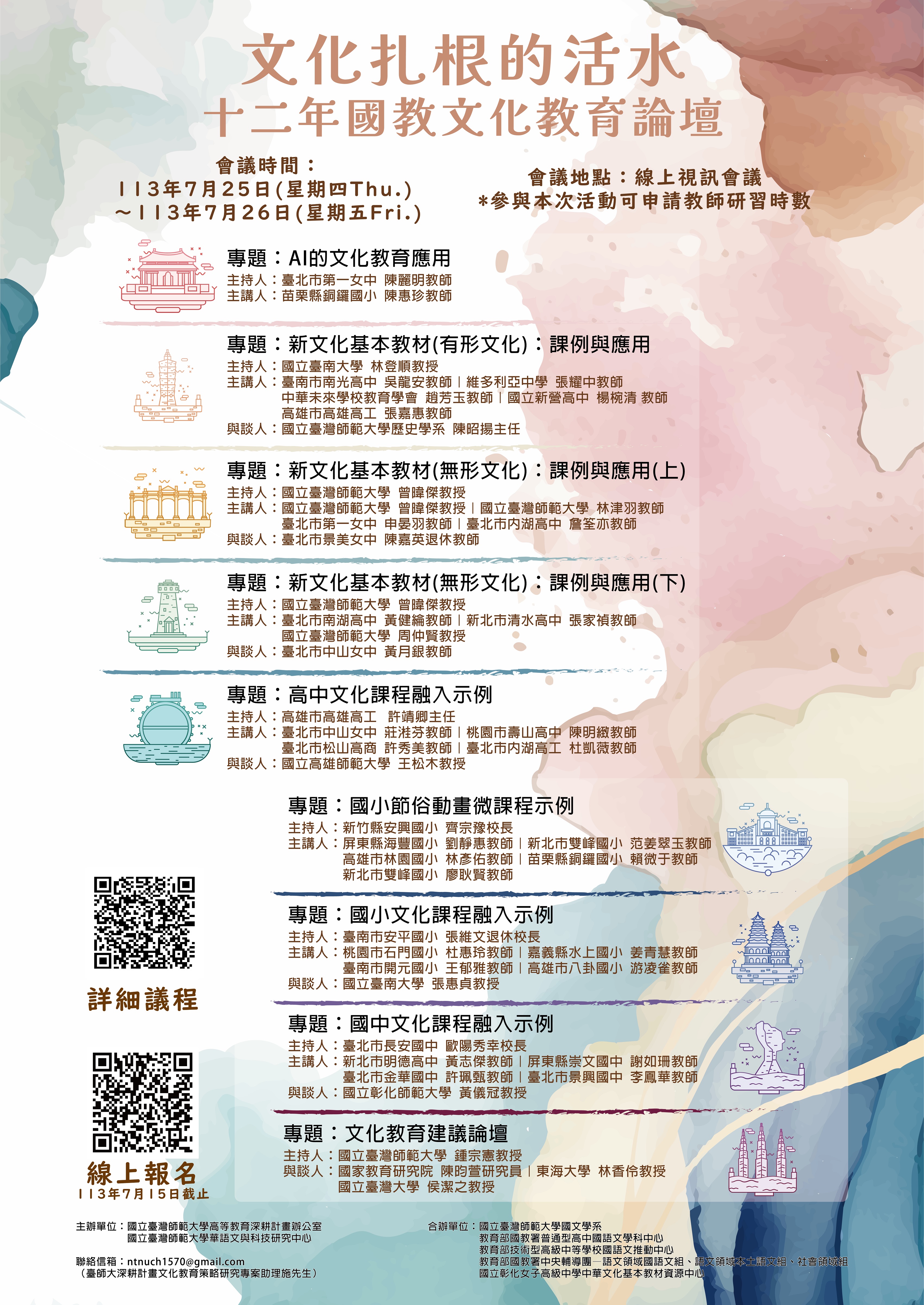 報名QRC議程內容113年論壇議程0715 admin 相关文章112年「傳統與AI世代的國語文教學─生活與文化教育論壇」線上活動2023 年 6 月 20 日 上一篇文章112年「傳統與AI世代的國語文教學─生活與文化教育論壇」線上活動